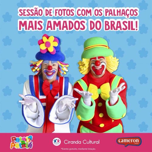 A dupla de palhaços mais amada do Brasil estará na Feira do Livro da Cameron, no próximo domingo, para tirar fotos com os fãs e mostrar livros incríveis. Para que todos possam aproveitar esse momento especial, serão distribuídas senhas para as fotos com antecedência, na própria Feira do Livro.